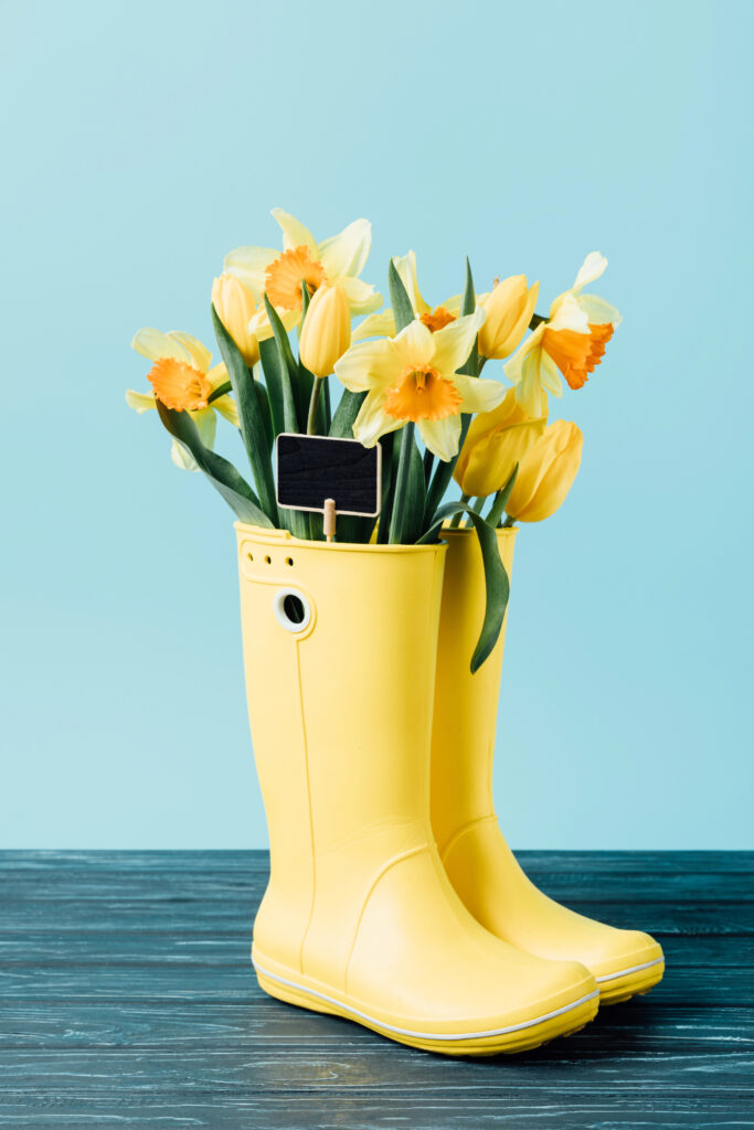 Easter decoration ideas: pair daffodils with brightly colored Wellington boots