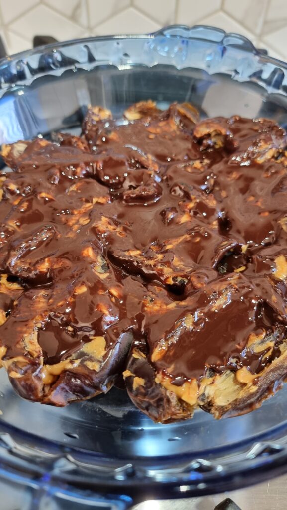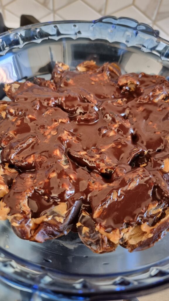 - Pour the melted chocolate mixture over the peanut butter layer.