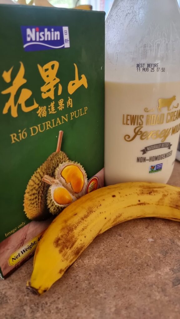 - Place the peeled banana and the seedless durian pod into a jug. (You can microwave the durian if frozen gentle on defrost in the microwave until you can get the seed out, make sure not to heat it).