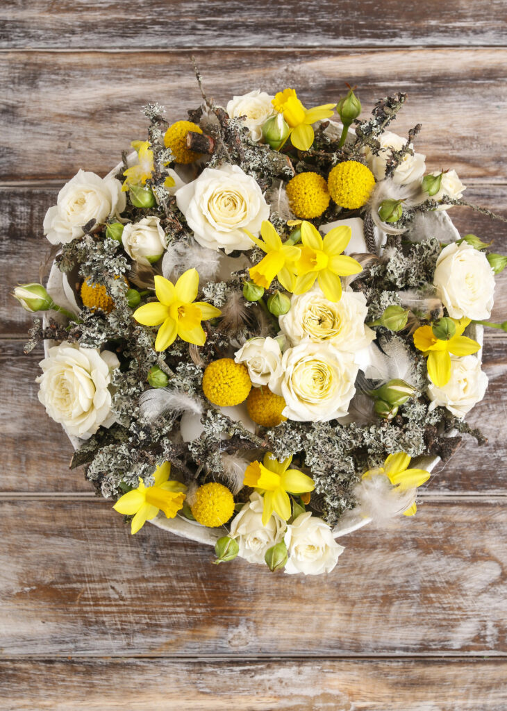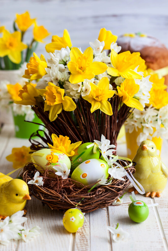 - The twist: Instead of a regular vase, use a hollowed-out bird’s nest (craft store variety), or arrange flowers around small decorative eggs, plastic bunnies, or chicks nestled at the base. You can also use a basket as your container for a rustic feel.