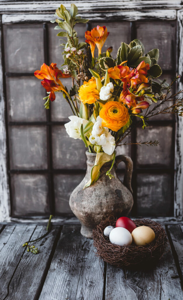 • How to create: Use a mix of informal flowers like cosmos, snapdragons, lavender, and some leafy sprigs. Don’t worry about perfect symmetry. Arrange them loosely in a mason jar or an antique-looking ceramic vase. Tie a piece of twine around the neck and hang a small, painted wooden egg from it.