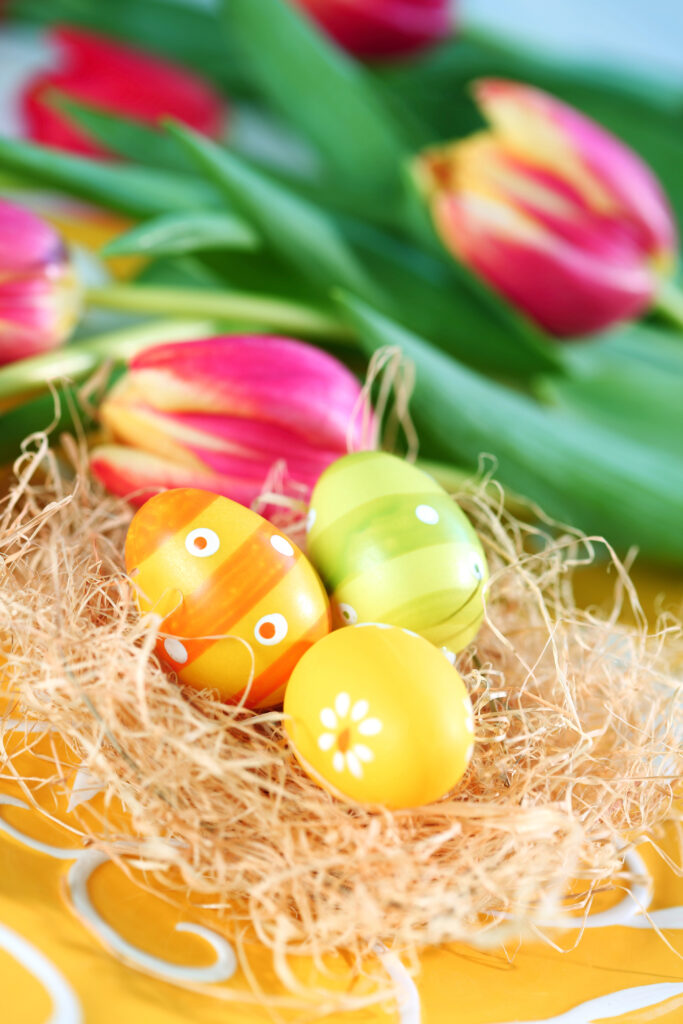 • How to create: Choose three bunches of tulips in soft pastel colors like pink, yellow, and lavender. Trim the stems to varying heights and place them in a clear glass vase. Allow them to “dance” freely. Around the base of the vase, scatter a few pastel-colored mini eggs or a small, decorative ceramic bunny.