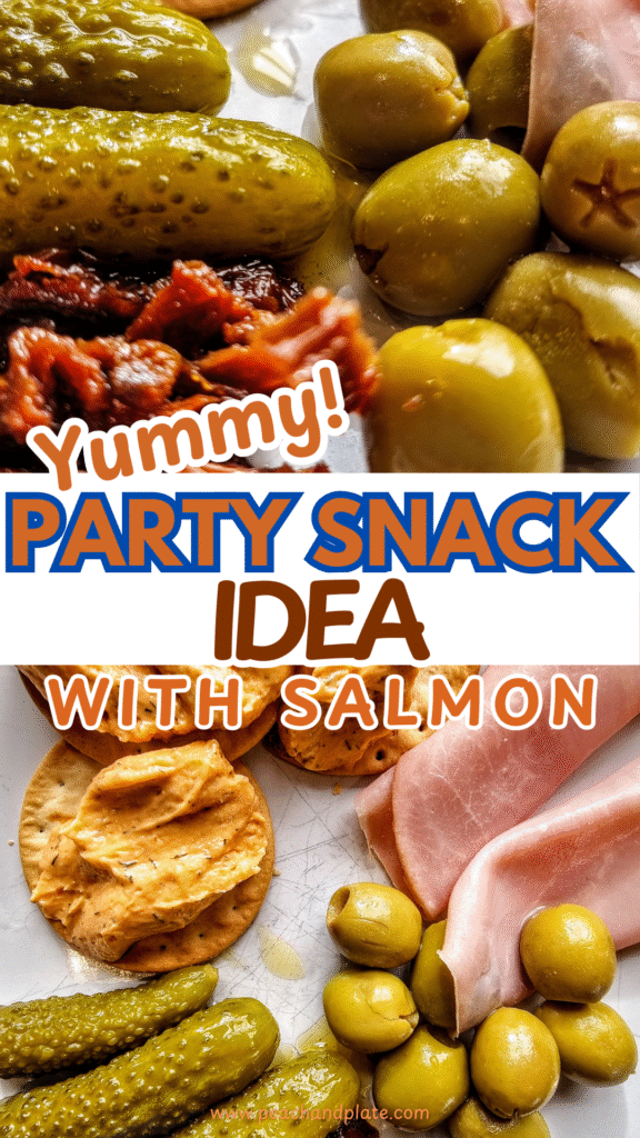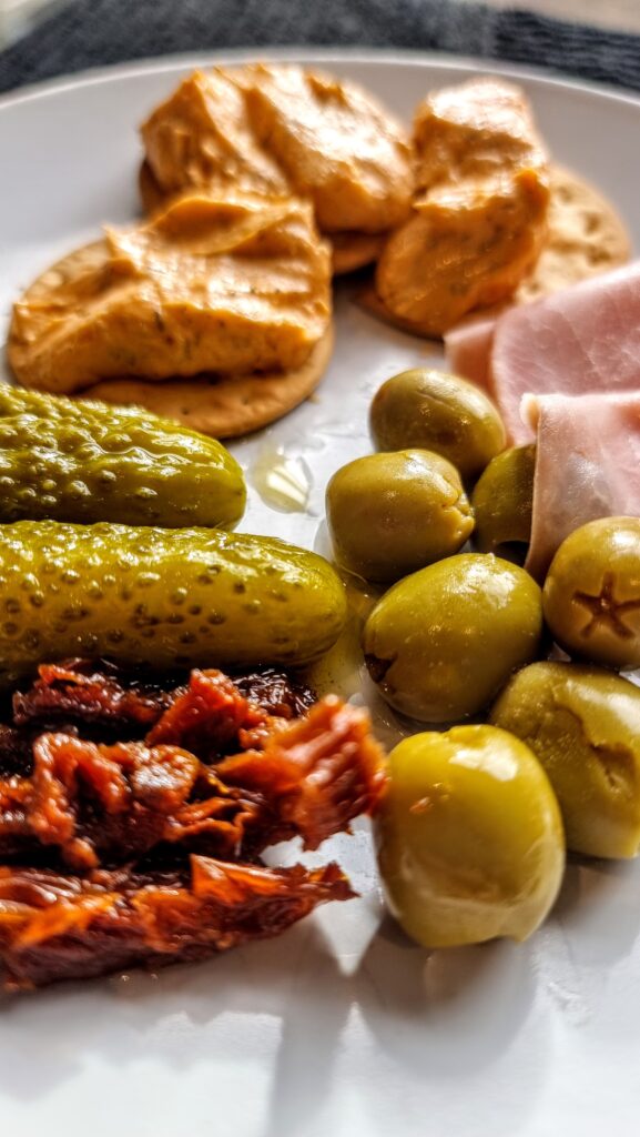 You’ll need small cornichons or baby gherkins, slices of ham, a bowl of green olives, sun-dried tomatoes, salmon pate, and some crunchy crackers. These ingredients work well together and create a nice balance of salty, tangy, and rich tastes.