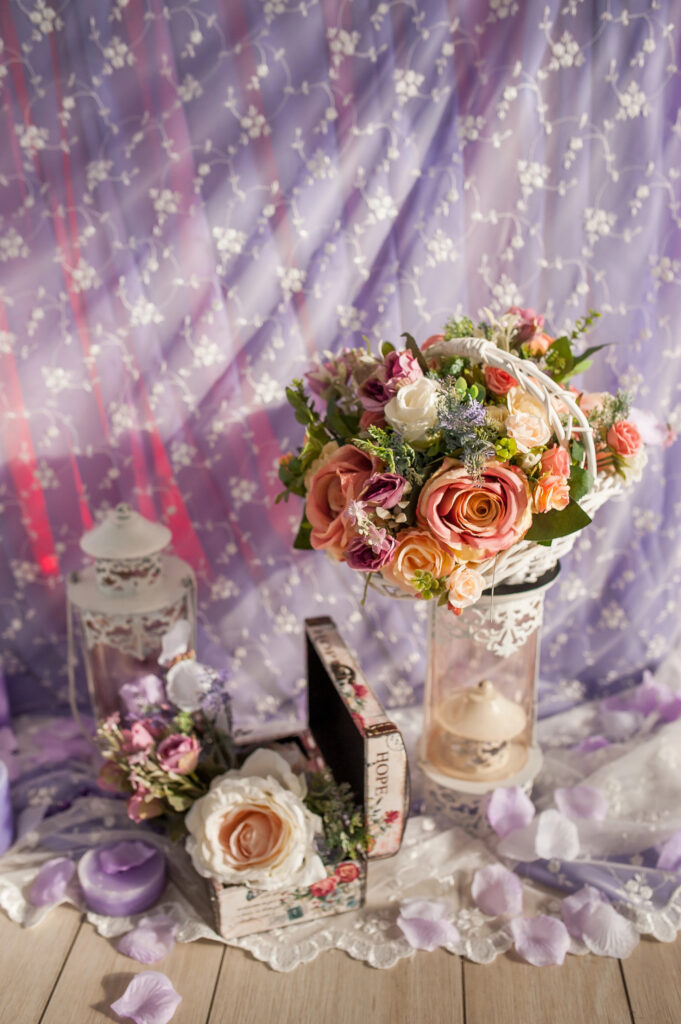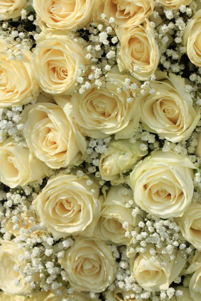 White roses symbolize purity, innocence, and new beginnings. They are a traditional choice for weddings, embodying unity and honor. White roses can also represent remembrance, making them suitable for solemn occasions. This picture is a beautiful pairing of white roses with other small flowers for a wedding.