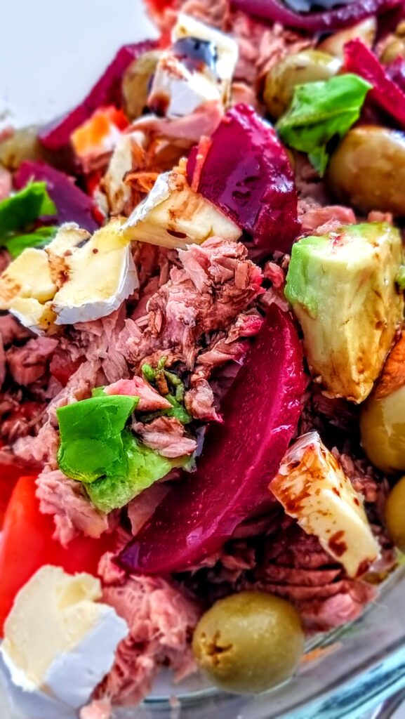 This meal hits that perfect sweet spot of fresh + creamy + salty + savory. The beetroot adds earthy sweetness, the brie gives it creaminess while the tuna and avocado gives a richness, and the basil brightens up the whole plate. It’s one of those things that looks pretty, fills you up, and leaves you feeling like you ate something truly good.